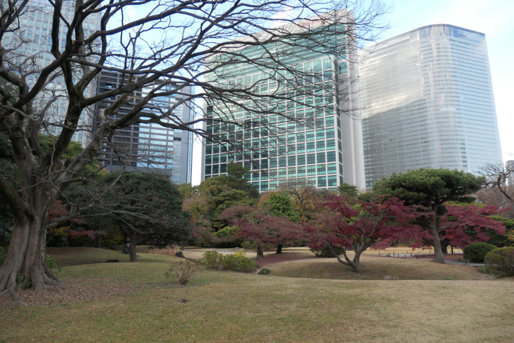 季節によって見所が変わるのも庭園の醍醐味であり、秋になると葉が赤いものや黄色いものが所々にあり、庭園を彩っていました。後方には汐留のビル群が並び、紅葉と高層ビルが東京の都会でしか見られない貴重な秋の名所だと思います。東京には他にも庭園はたくさんありますが、江戸時代から幾度の災害を乗り越えた貴重な存在であることを忘れずに、行って見てください!!