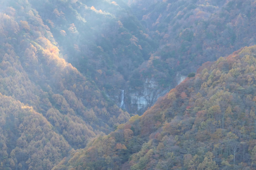日の光が絶妙で最高の景色ですが、滝はわかりにくいです。中央に小さく映っているので拡大写真を見てみると↓