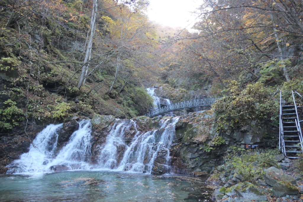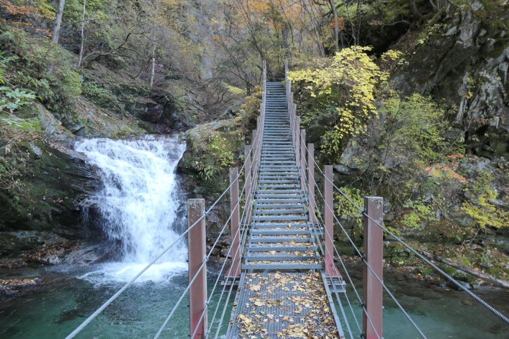 さらに進むと三の滝、別名見返りの滝が現れます。こちらもなかなか落差があります。つり橋が階段のようになっていて勾配があることがわかると思います。高さは川とそんなに離れてないため、真上から川を見ると透明度に驚きました。