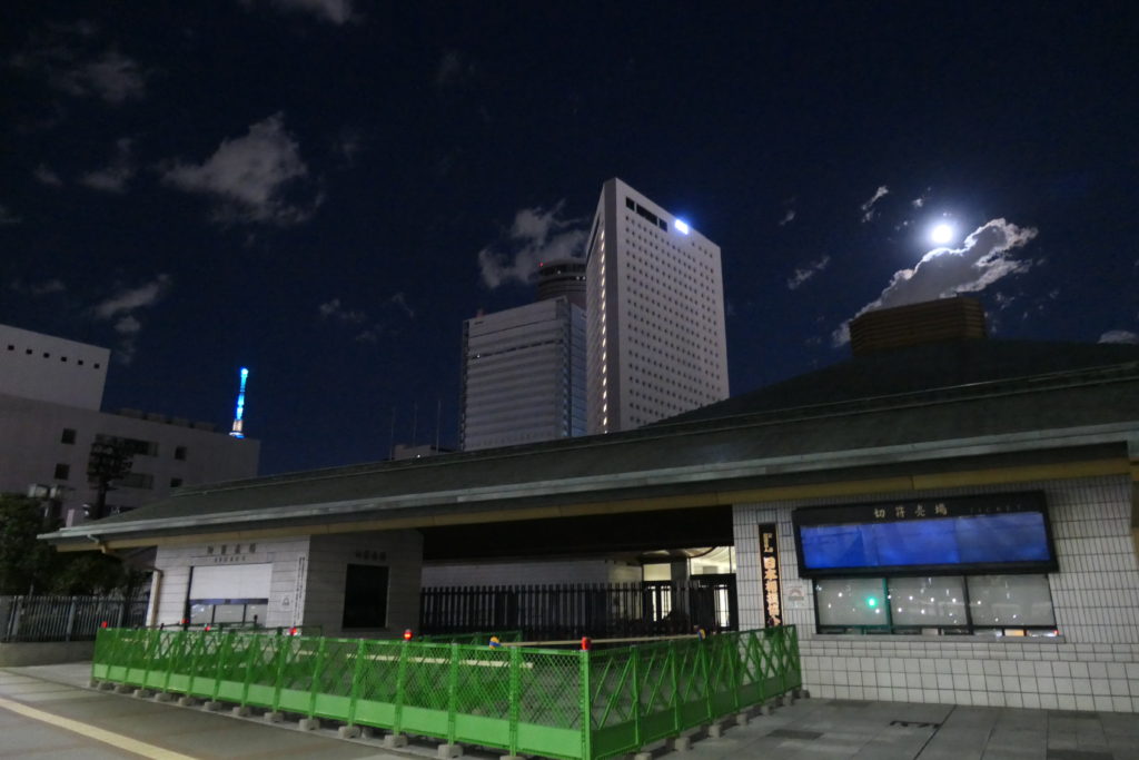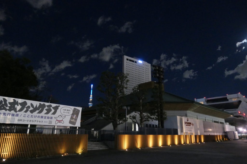 月の明かりがとても明るくて、天然のライトアップとなって国技館を照らしていました。同じ墨田区内にある東京スカイツリーも見えていました。