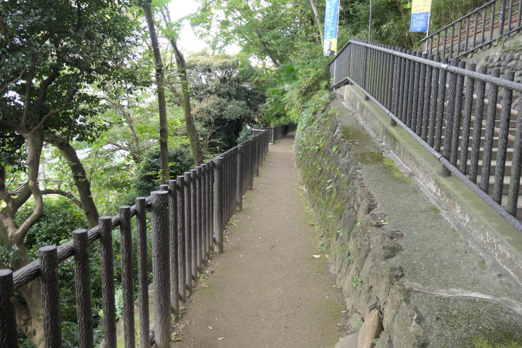飛鳥山公園の入口は全て階段や坂になっているのですが、先ほどの入口から登るのが一番しんどいかと思われます。階段を登ると右は階段、左はやや平坦な細い道と分かれます。左の道は飛鳥の小径と呼ばれ、飛鳥山公園の断崖絶壁の脇を通ります。左の崖の下は線路がたくさん並んでいて、新幹線やたくさんの電車を見ることができます。初夏になるとアジサイが咲くので、見頃にの時期には行って見たいものです。