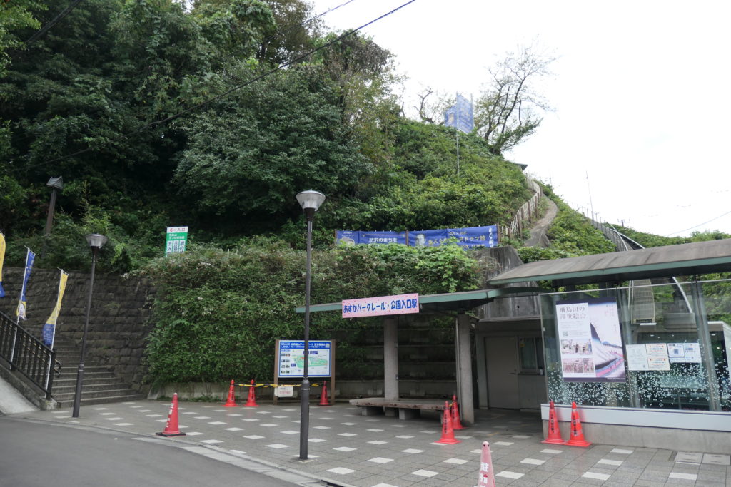 王子駅の中央口から左へ歩いて行くと、直ぐに飛鳥山公園の入口が現れます。上の写真を見ての通り、平地からいきなり急こう配になっているため、モノレールか階段で登るようになっています。
