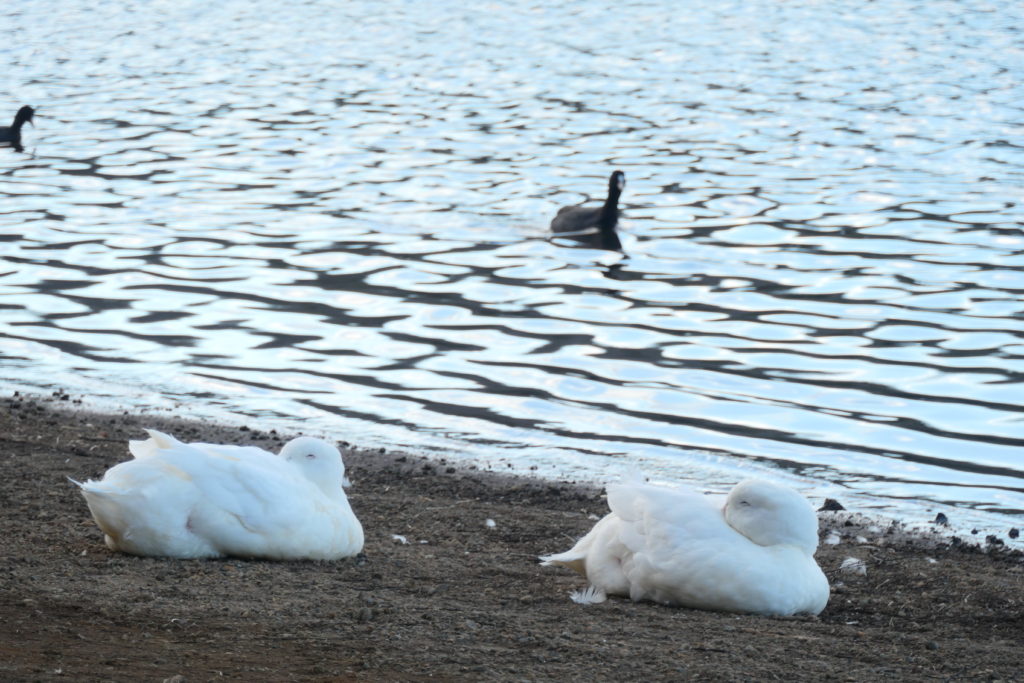 湖岸にちらほら白い羽が落ちていたので、辿ってみたらアヒルが休んでいました。気持ちよさそうに休んでいたため、遠くから撮影しました。羽毛が暖かそうでした。