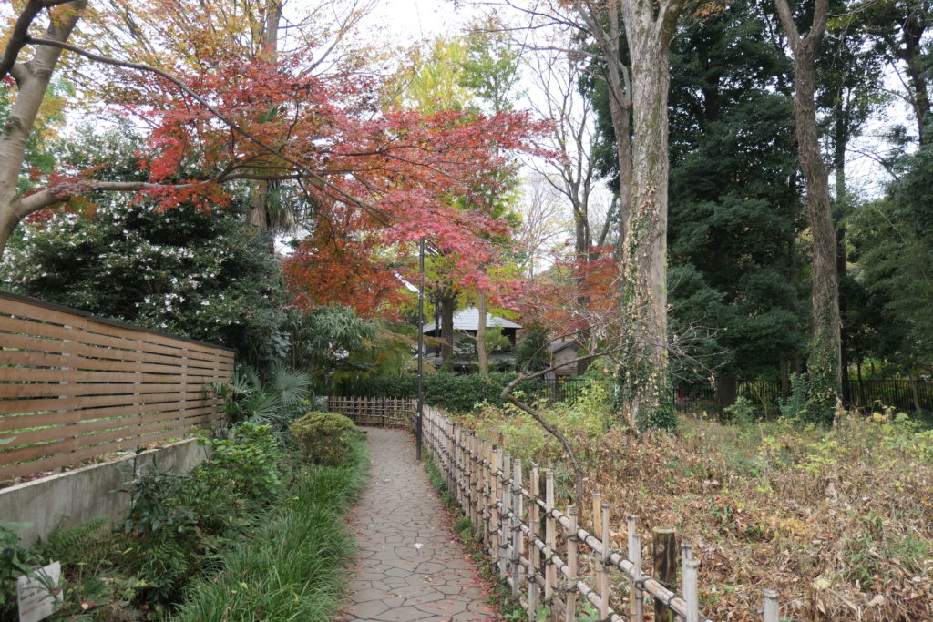 ご覧のように小道であることから、歩行者のみの通行となっています。日本庭園の中を歩くような雰囲気でありながらも、地域の人々も利用する生活道路にもなっています。秋に撮影した写真であり、沿道を彩るモミジが紅くきれいでした。