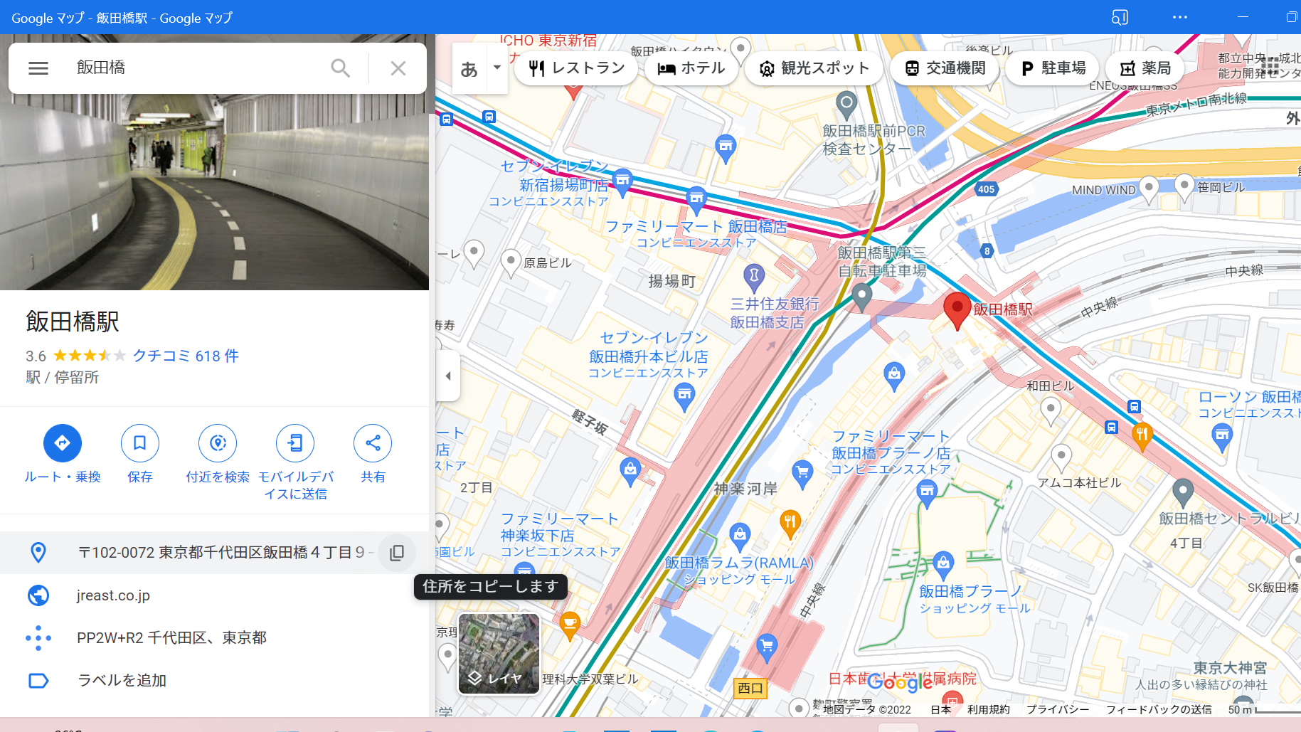 GoogleMapからスクリーンショットをしたものですが、JR中央線と地下鉄4路線が飯田橋駅を通っています。