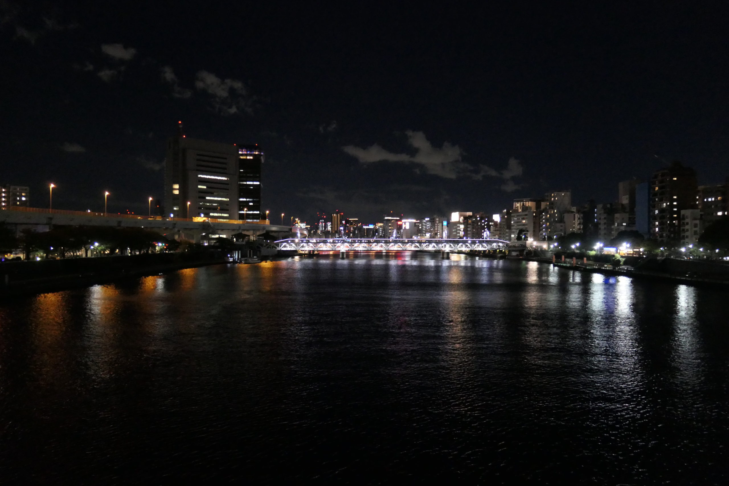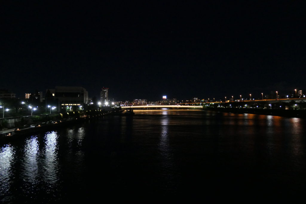 隅田川は花火以外に桜の名所としても有名です。隅田川に架かる言問橋付近にある隅田公園は、日本さくら名所百選に選定されています。公園の様子は暗くて見えないのですが、川の両岸の緑地になっている所が隅田公園です。