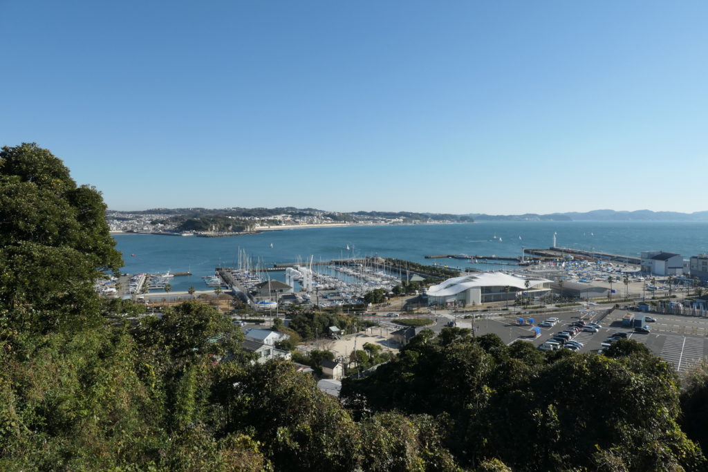 展望デッキから江の島の北東側の景色が見え、手前の広場が聖天島公園です。奥にヨットハーバー、海の向こうは鎌倉方面になります。