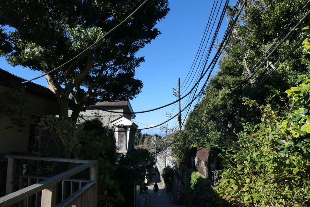 稚児ヶ淵から再び来た道を戻ります。奥津宮を過ぎて商店街に入ります。商店街の中に羊羹屋さんがあるのですが、羊羹屋さんの向かいに下道へ続く道があります。T字路を左折します。この下道は大鳥居がある仲見世通りまで下っています。江ノ島の中では比較的緩やかな坂ですが、途中に見所が無く、森と住宅街がある静かな場所が続いています。仲見世通り込みで江の島入口まで約16分、約1㎞、自分との戦いです。稚児ヶ淵、岩屋辺りから遊覧船べんてん丸に乗ることは可能ですが、今回はあくまでも修行の道ということで自力で歩くことにしました。