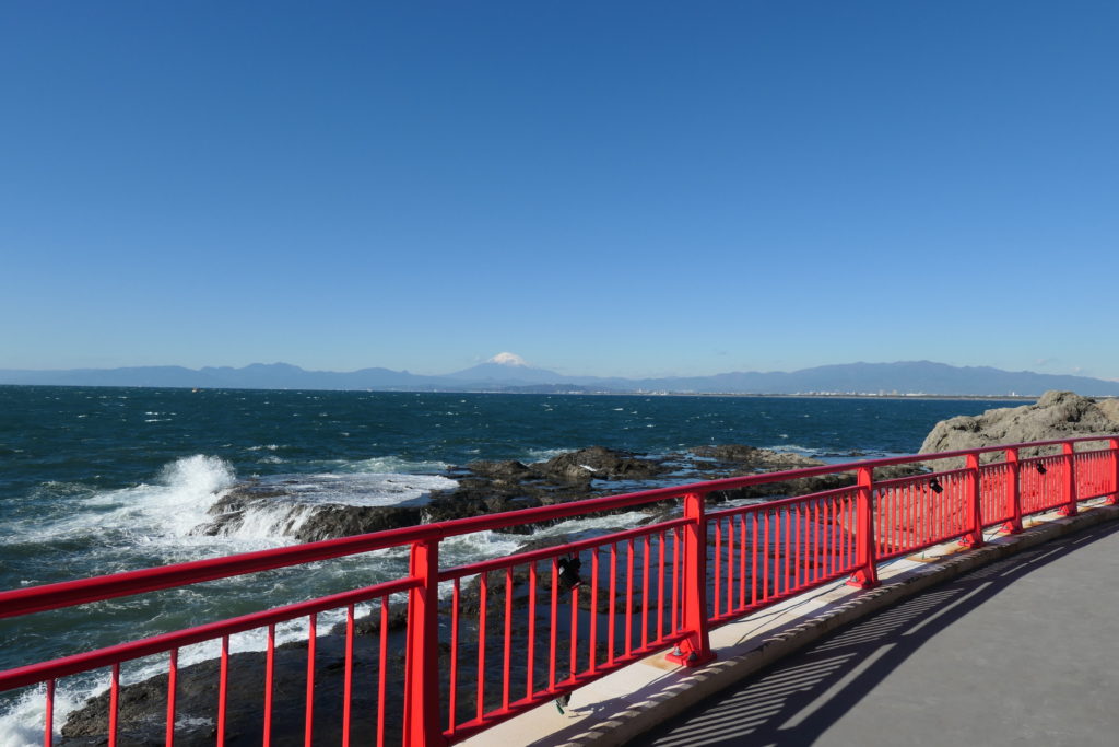 階段を下ると海沿いに出て、富士山が良く見える絶景スポットとなります。撮影している場所は橋の上で、赤い橋が特徴の岩屋橋です。不安定な岩場の上を通っています。渡り切ると岩屋が見えてきます。