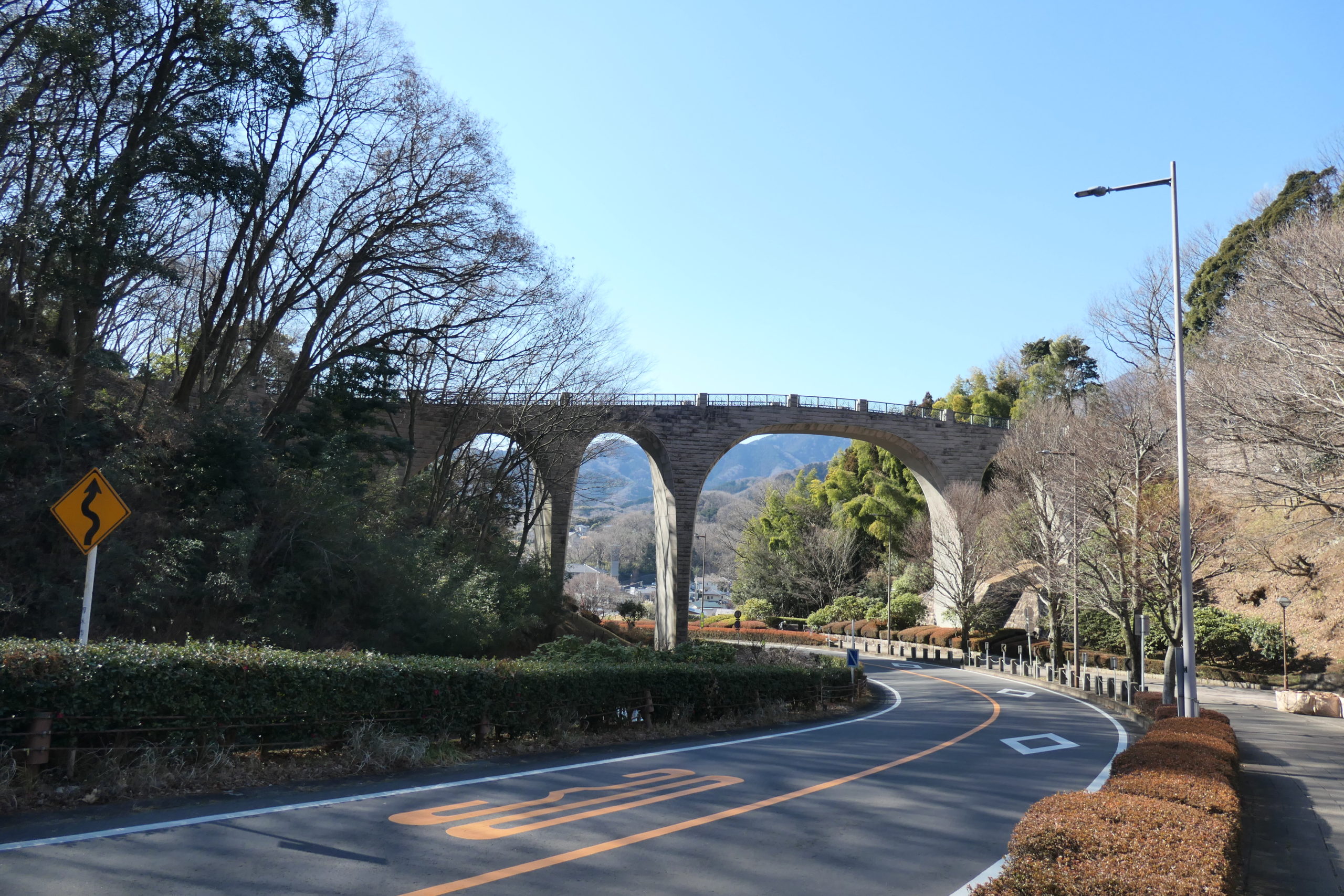 道路の両脇の山が七沢森林公園であり、頭上の橋は歩行専用の公園の跨道橋となっています。