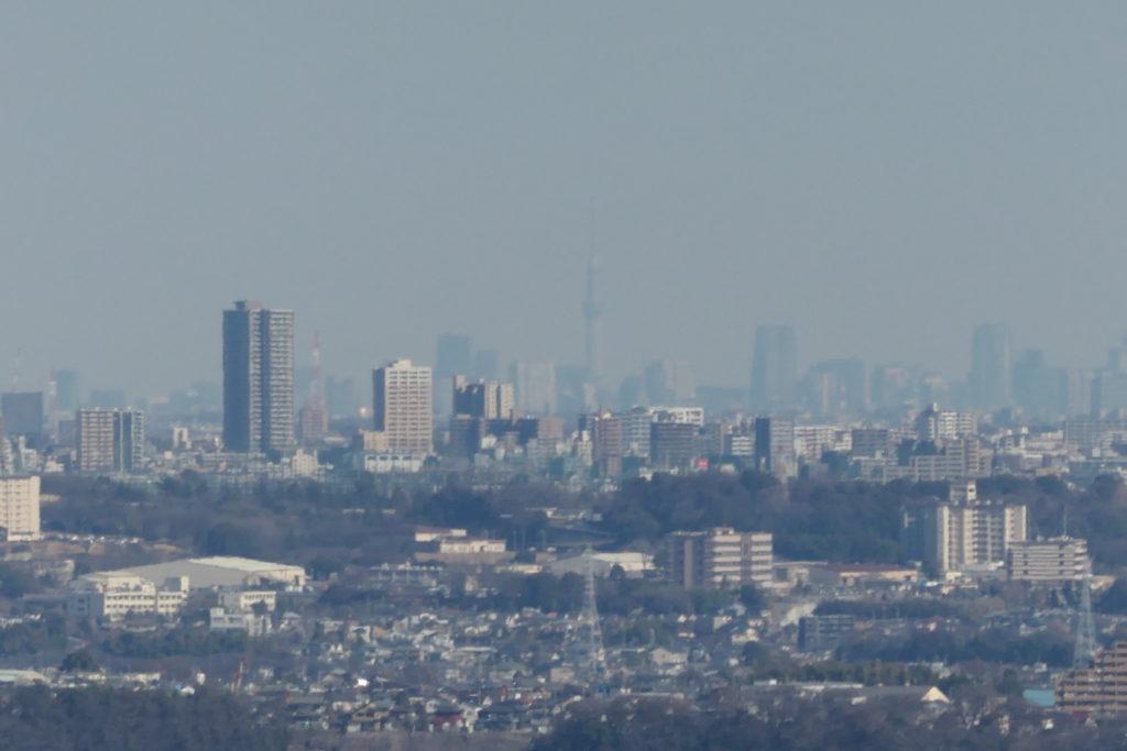 先ほど紹介したながめの丘に到着し、関東平野を眺めました。標高は183mで公園内で一番高い所ではありませんが、一番場が目が良い所だと思います。遥か先が新宿方面であり、限界まで拡大すると約60㎞先にある東京スカイツリーが見えます。