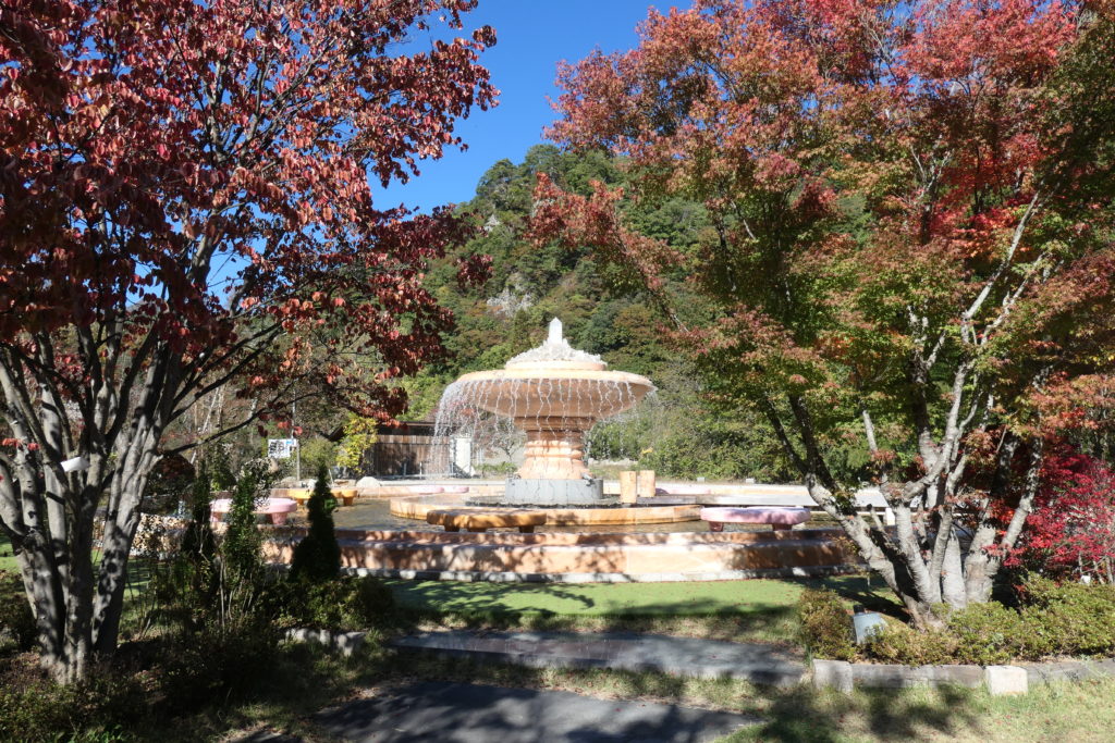 水晶が輝く噴水の後には、鮮やかな紅葉が風に吹かれて、疲れた体に癒されました。水晶が虹のように輝いて見えた方には、幸せになれると言われています。是非見に行ってみてください!