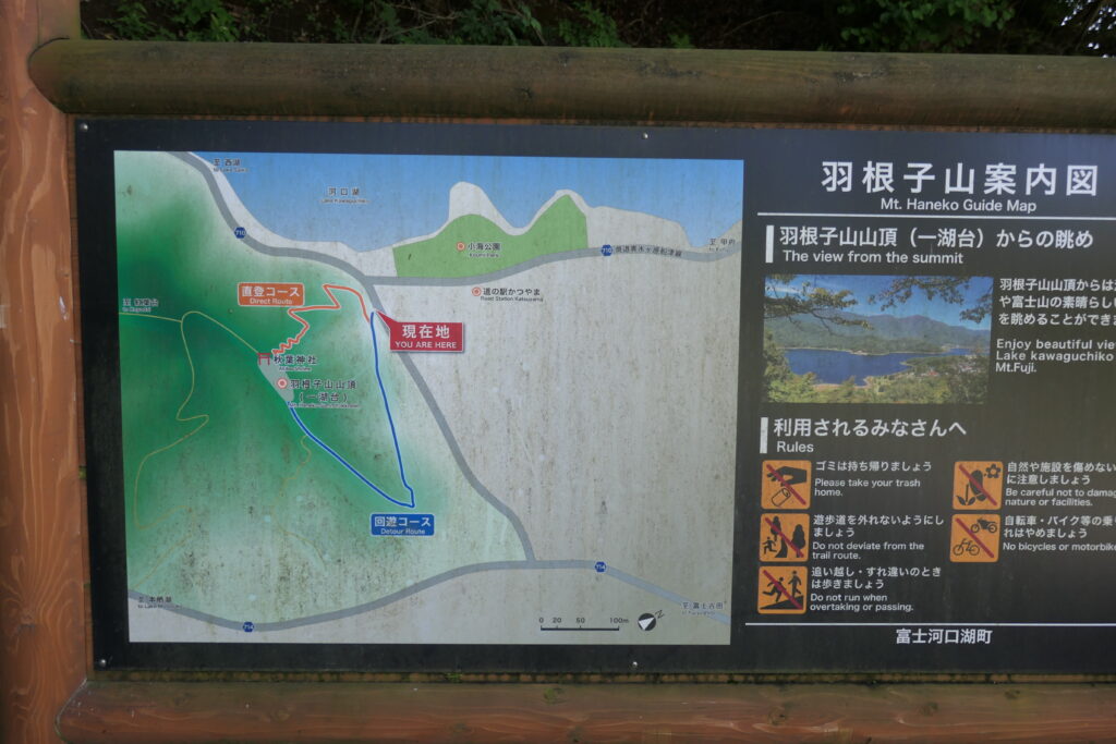 今回は行きませんでしたが、山頂には15~20分くらいで登ることができるようです。山頂から河口湖はもちろん、反対側には富士山を見ることができます。