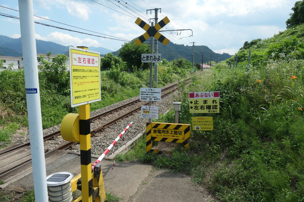 九鬼山の登山口に向かうため、富士急行線を越えないと行けません。そのために、車が通れない小道を通って行きます。線路を渡るのですが…