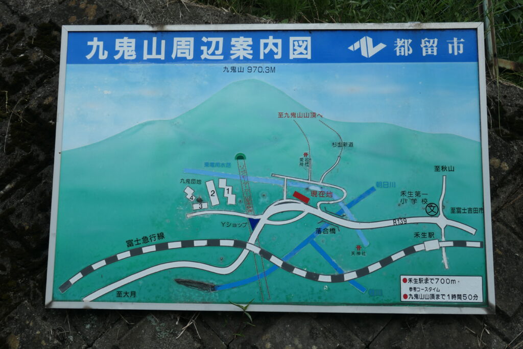 登山道の案内看板があり、地図もあります。九鬼山の下を貫通する、リニア新幹線の実験線も描かれています。