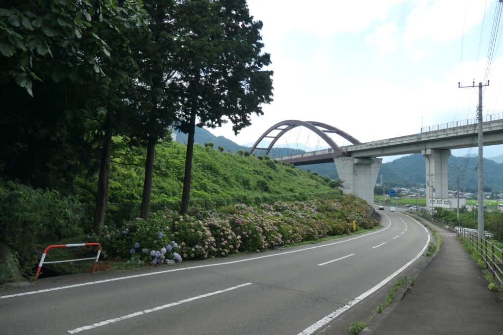 道の駅つるから中央自動車道沿いの道を南へ行くと、桂川に架かる禾生橋があります。橋の上からの景色が良く、一番高い山が山梨百名山の一つにある九鬼山です。九鬼山の登山口まで歩いて行きます。