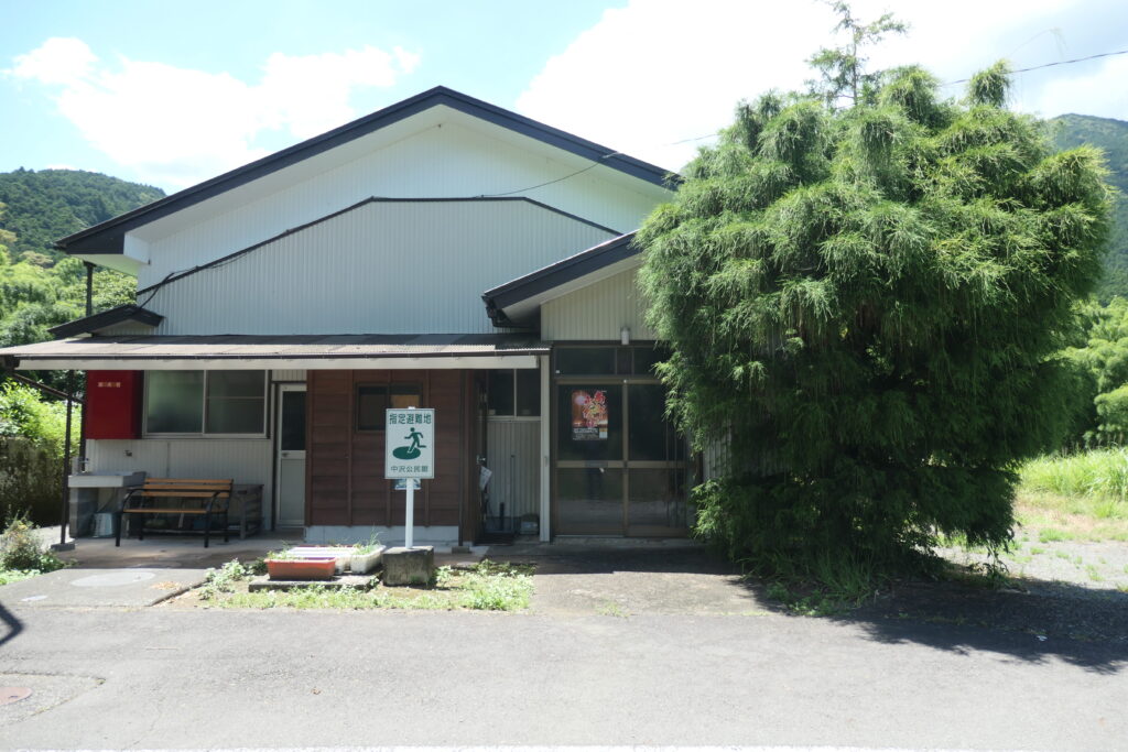 - 左側に中沢公民館が見え、右側に駐車場がある。(ヘリポートが併設)