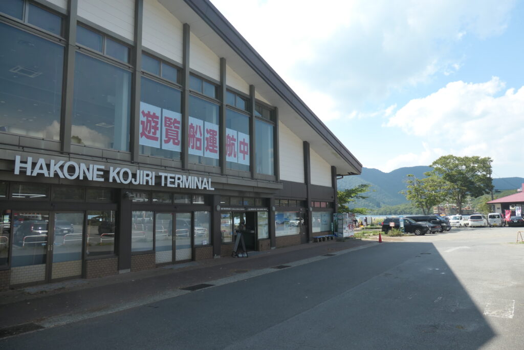 スタート&ゴールは元箱根港です。箱根神社が近くにあります。湖の向こうに鳥居が見えます。箱根海賊船、芦ノ湖遊覧船の桟橋があります。乗り場の周りは、自転車から降りて歩くように、標識があります。
