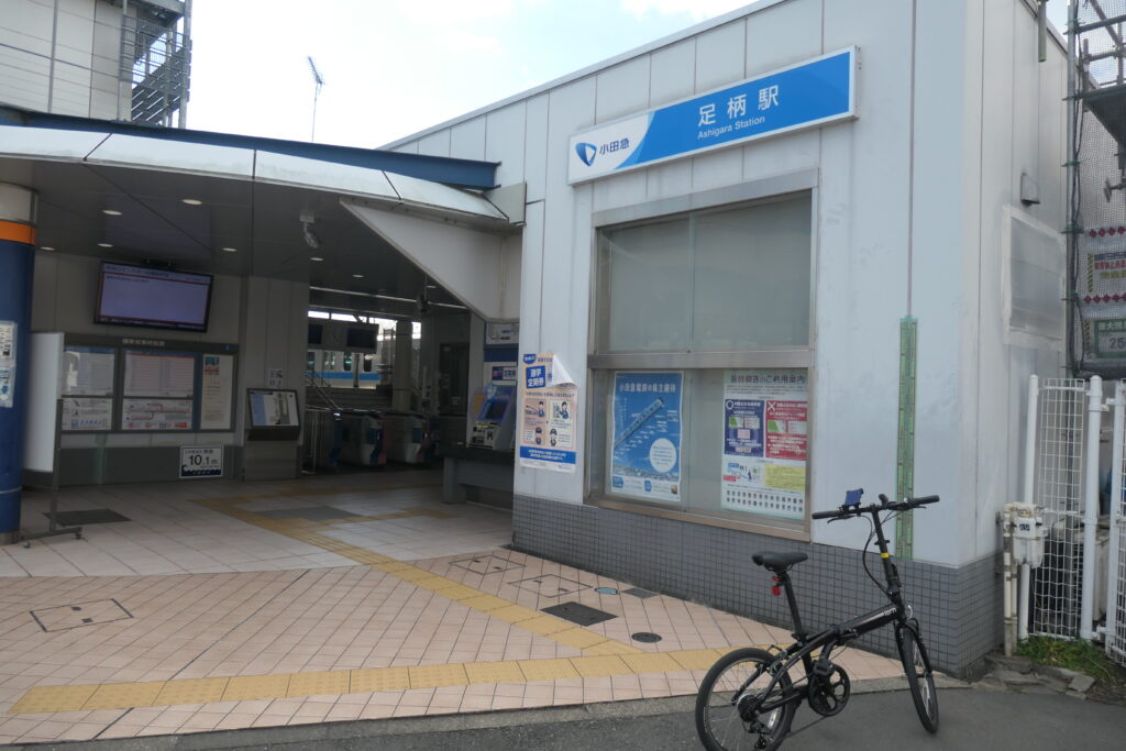 井細田駅から700m、足柄駅です。小田急小田原線の駅であり、小田急線の中で一番小田原市役所に近い駅です。この辺りは、大雄山線と小田急線が近く並行しているので、駅間が密集しています。ただ、共通して平面で踏切が多く、渋滞が発生しやすいエリアです。時間帯によっては走りにくいかもしれません。