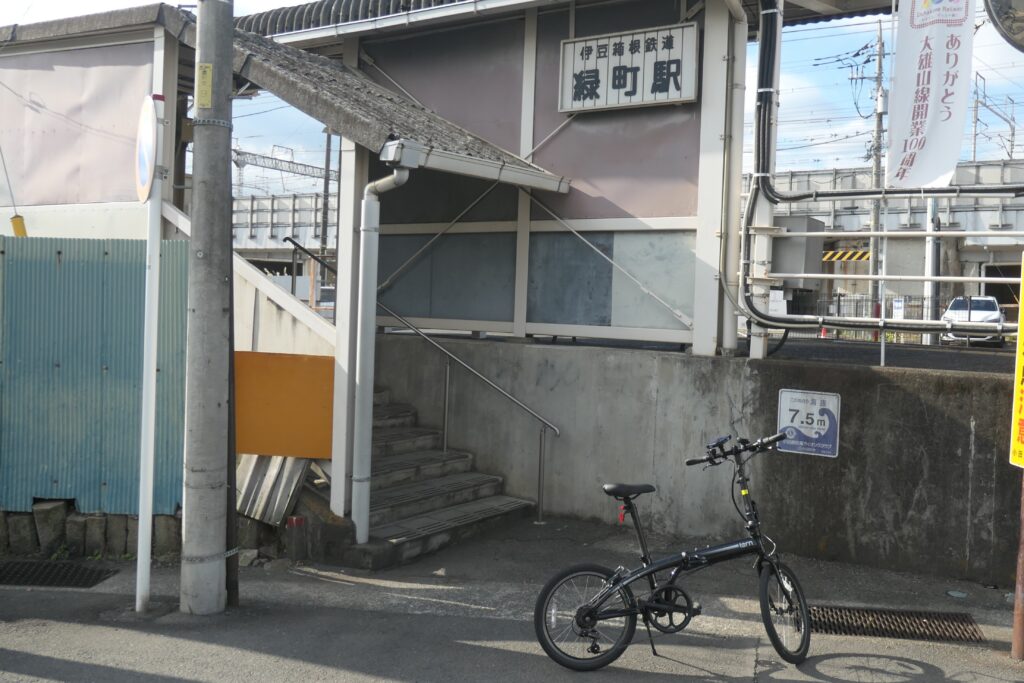 小田原駅から550m、伊豆箱根鉄道大雄山線の緑町駅に着きました。小田原駅と井細田駅の間にあります。出入り口があるだけで、シンプルな造りです。
