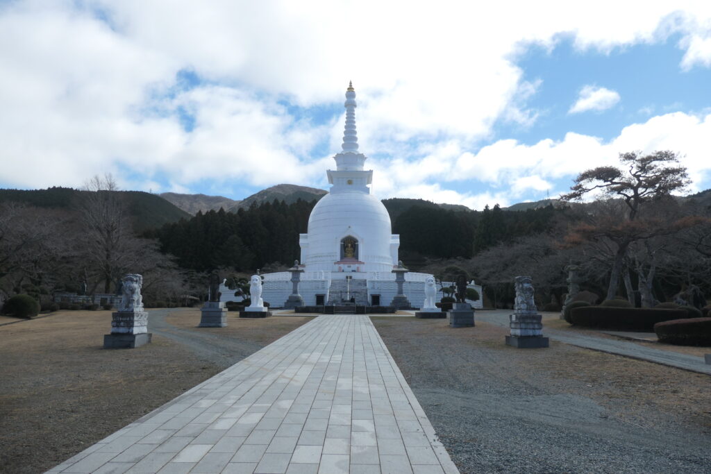 東山地区から南に2,3kmくらいに、ひときわ目立つ塔がある、富士仏舎利塔平和公園に着きました。大きな塔は仏舎利塔であり、インドのネルー初代首相から贈られた仏舎利(釈迦の遺骨)が納められています。