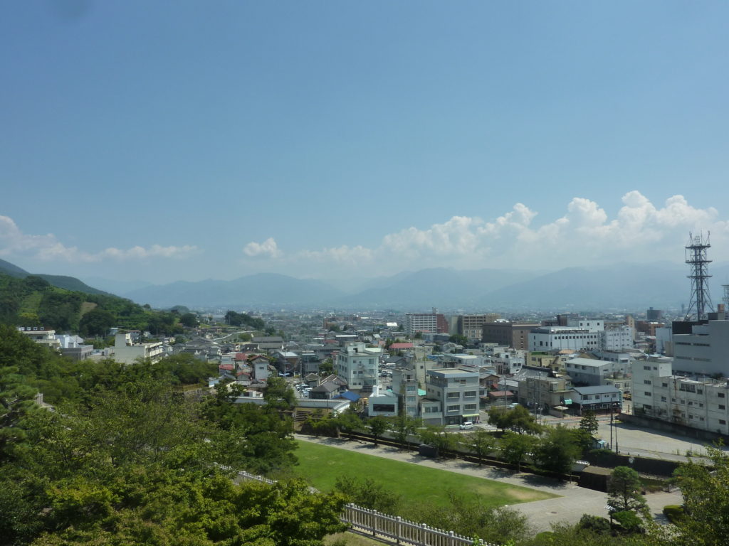天守台から見た景色です。とても眺めがよく、甲府盆地を見渡すことができます。この日は雲で隠れてしまいましたが、富士山を見ることができます。