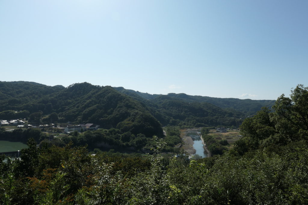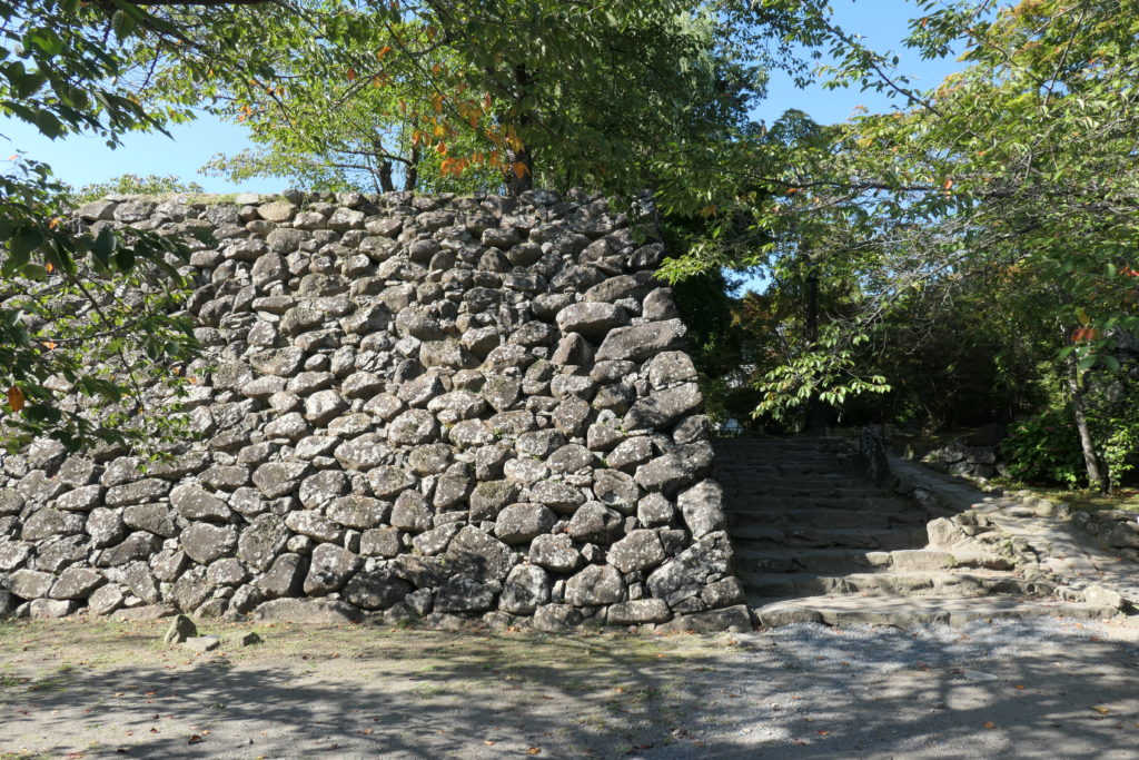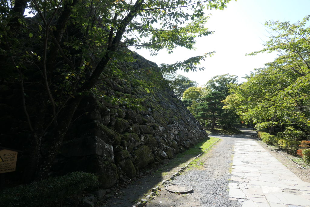 敷地の中は、本丸跡に懐古神社があり、天守台や二の丸跡は石垣が残っているものの、建物はありません。周りに木が多く、奥の方は春になると桜が咲き、日本さくら名所百選に選ばれるほど有名です。撮影当日は秋になる前なので、緑が多かったのですが、秋本番になれば赤く色づくと思います。