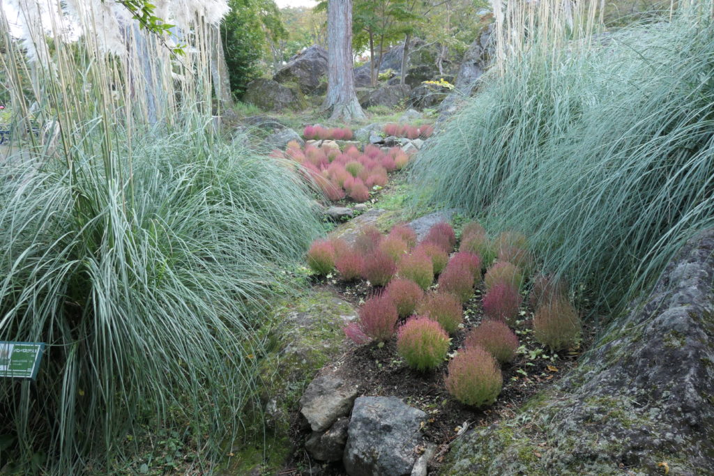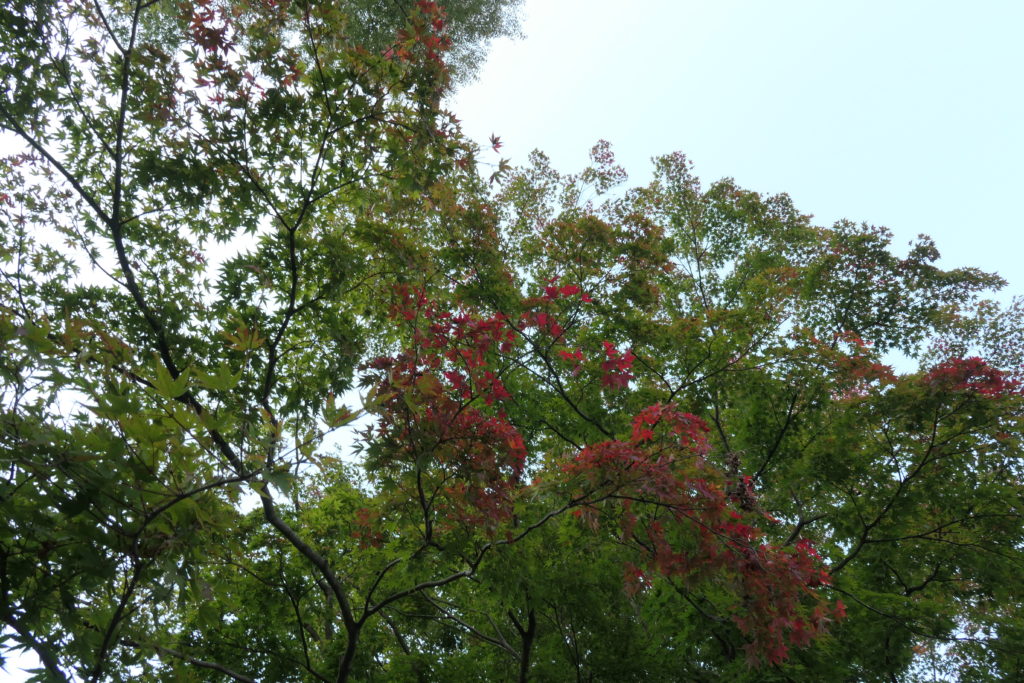 正門から反対側の西門まで登り、行きと帰りで違った道を歩いたのですが、いろんな植物がありました。紅葉も紅くなっていて、遠くの山も赤や黄色のまだら模様になっていました。