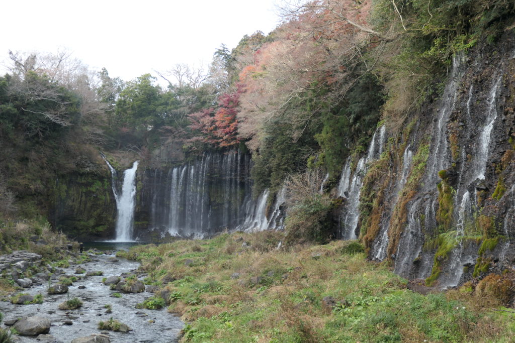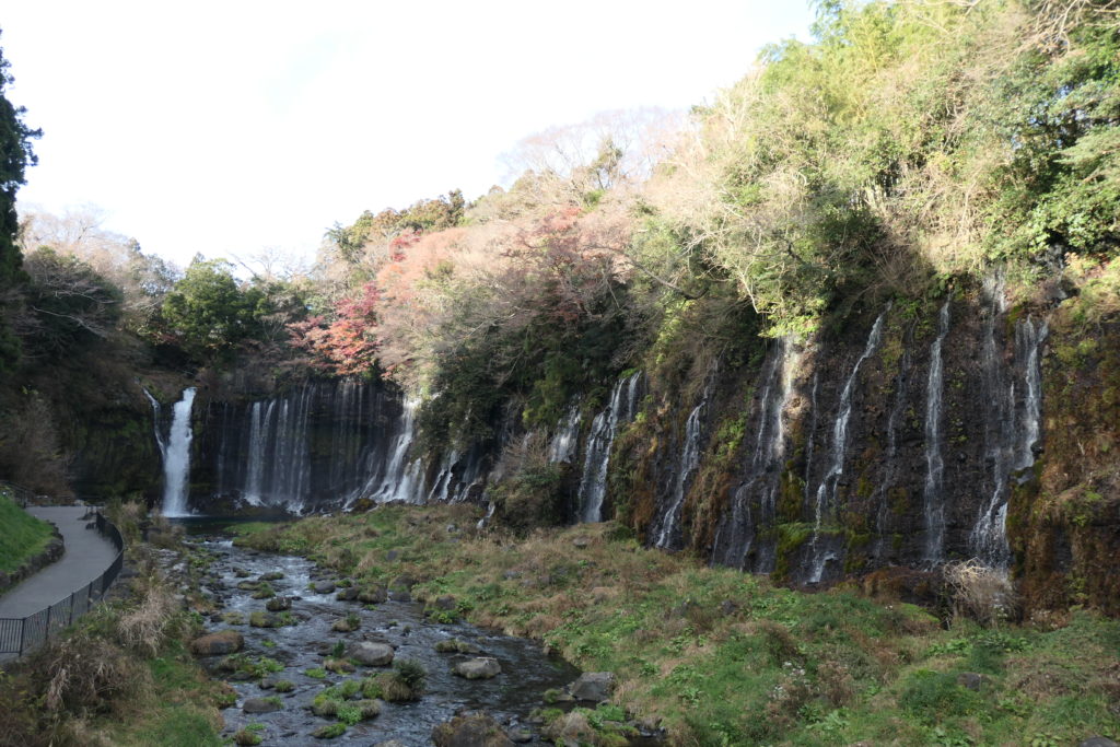 シーズン真最中ではなかったが、糸のようにきれいな滝に一部の紅葉が見れて満足しました。白糸の滝は2013年に「富士山-信仰の対象と芸術の源泉」の構成資産の一つとして、世界遺産に登録されました。世界遺産の登録に向けて歩道などが整備されていて、順路や展望スポットなどわかりやすく観光できるようになりました。上に映っている写真は順路の真ん中あたりのポイントで、滝つぼと真正面から撮影できます。