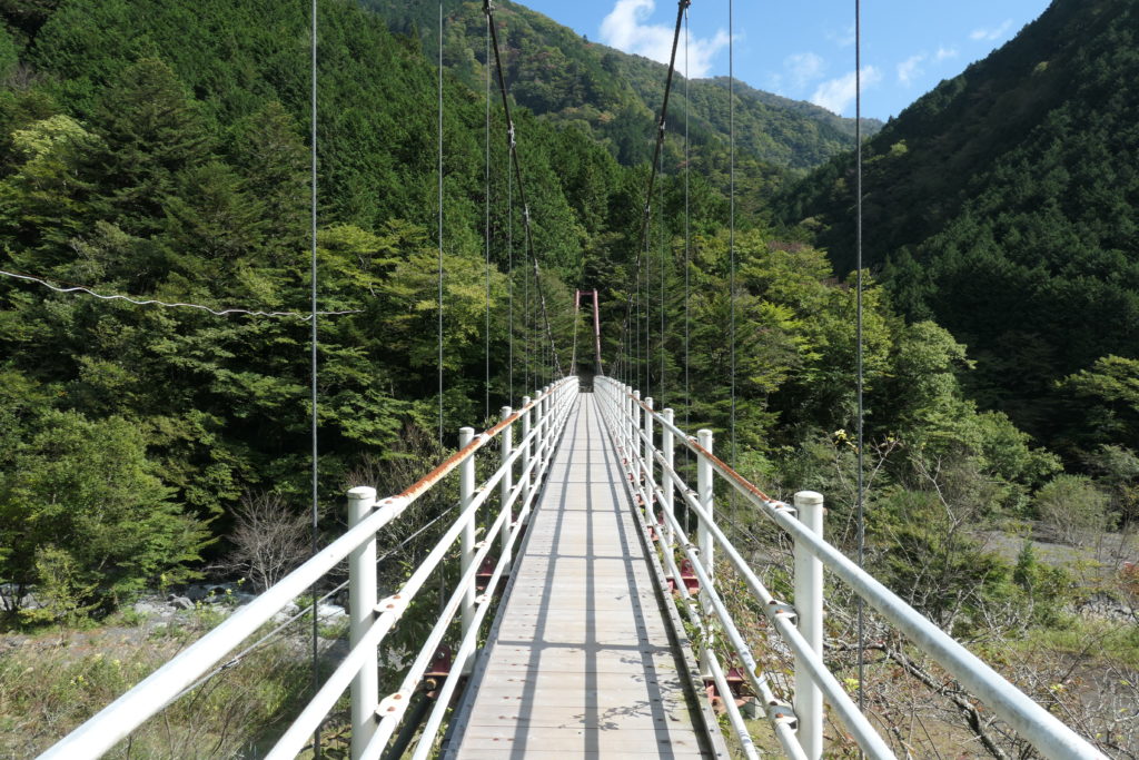 いざ歩くと早速大きなつり橋が現れます。寸又峡の夢のつり橋より欄干などしっかりしていますが、人数制限があり、揺れます。この橋を含めて3本くらい橋を渡りますが、この橋よりすごい橋が奥で待っています。最初の橋はカメラを持つ余裕があったので、橋の上から写真を撮ってみました。10月ですが、まだまだ青く、これから紅葉になる準備段階のようでした。