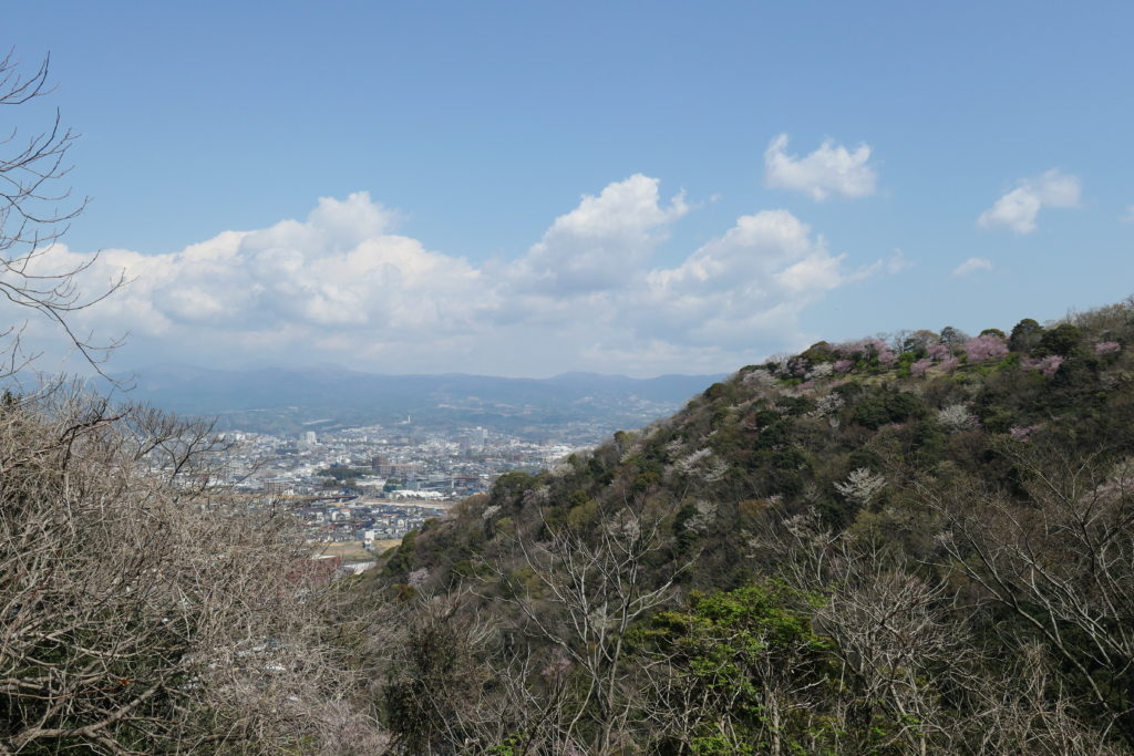 静岡県沼津市にある香貫山からスタートです。街から見える山なので、桜の時期になれば薄いピンクの模様になり、見頃がわかります。上の写真は中腹にある展望台で、車で行ける最上部で駐車場がすぐ近くにあります。当日は十数台置ける駐車場が満車になっていたほど、繁盛していました。