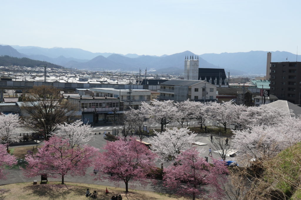 小諸市は標高が高く、少し寒冷のため咲いていない花が多かったです。天守台に咲く一本の桜が一番咲いていました。日当たりが一番いい場所であるため、良く咲いていました。右の写真は天守台から撮影した写真で、これからたくさん咲く桜たちです。お祭りの準備をしていたので、2,3日経ったら違った景色が見られたのかもしれません。次回は満開の時期に行って見たいと思います。